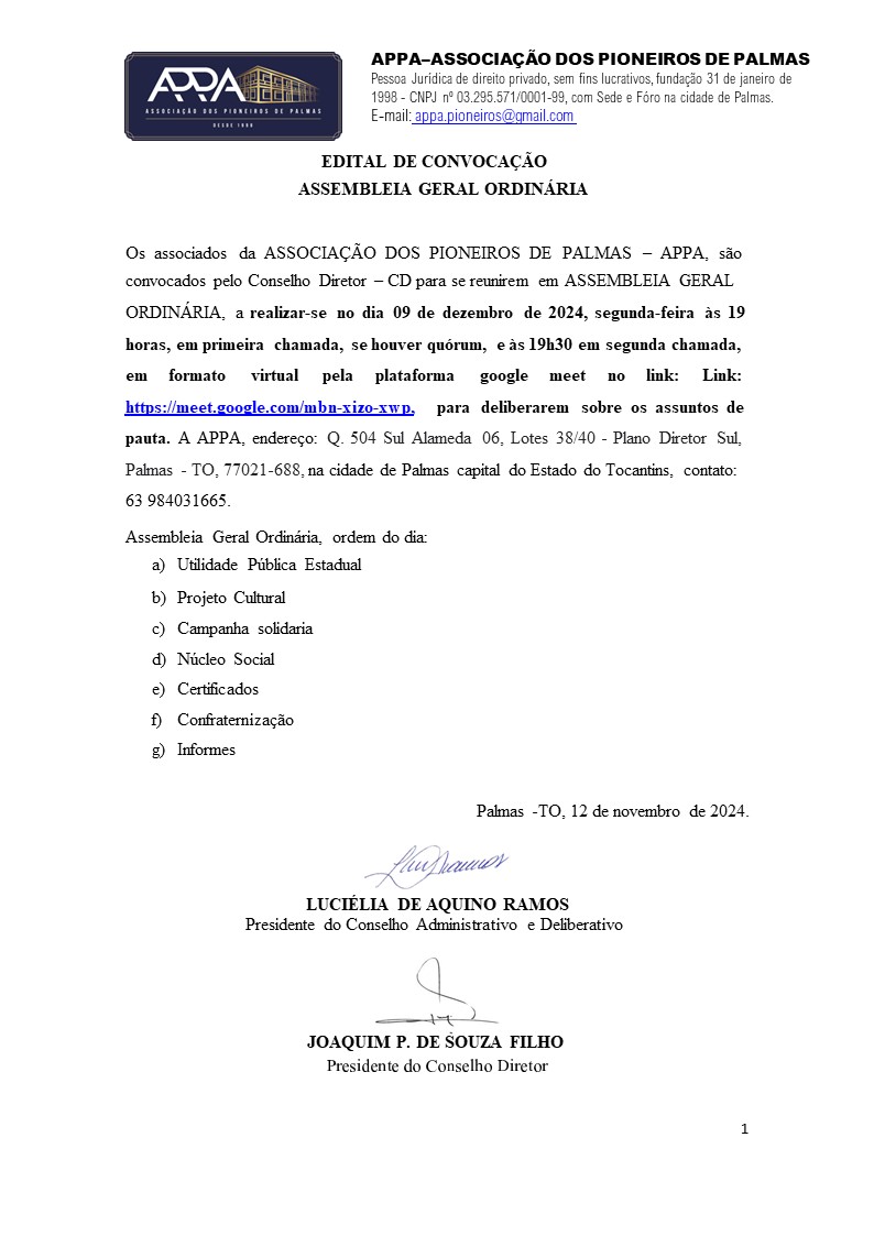 EDITAL DA ASSEMBLEIA GERAL ORDINÁRIA APPA/CAD/CD ASSEMBLEIA GERAL ORDINÁRIA APPA/CAD/CD dia 09 de dezembro de 2024, segunda-feira às 19 horas, em primeira chamada, se houver quórum, e às 19h30 em segunda chamada, endereço: Q. 504 Sul Alameda 06, Lotes 38/40 - Plano Diretor Sul, Palmas - TO Dezembro 2024 Baixar